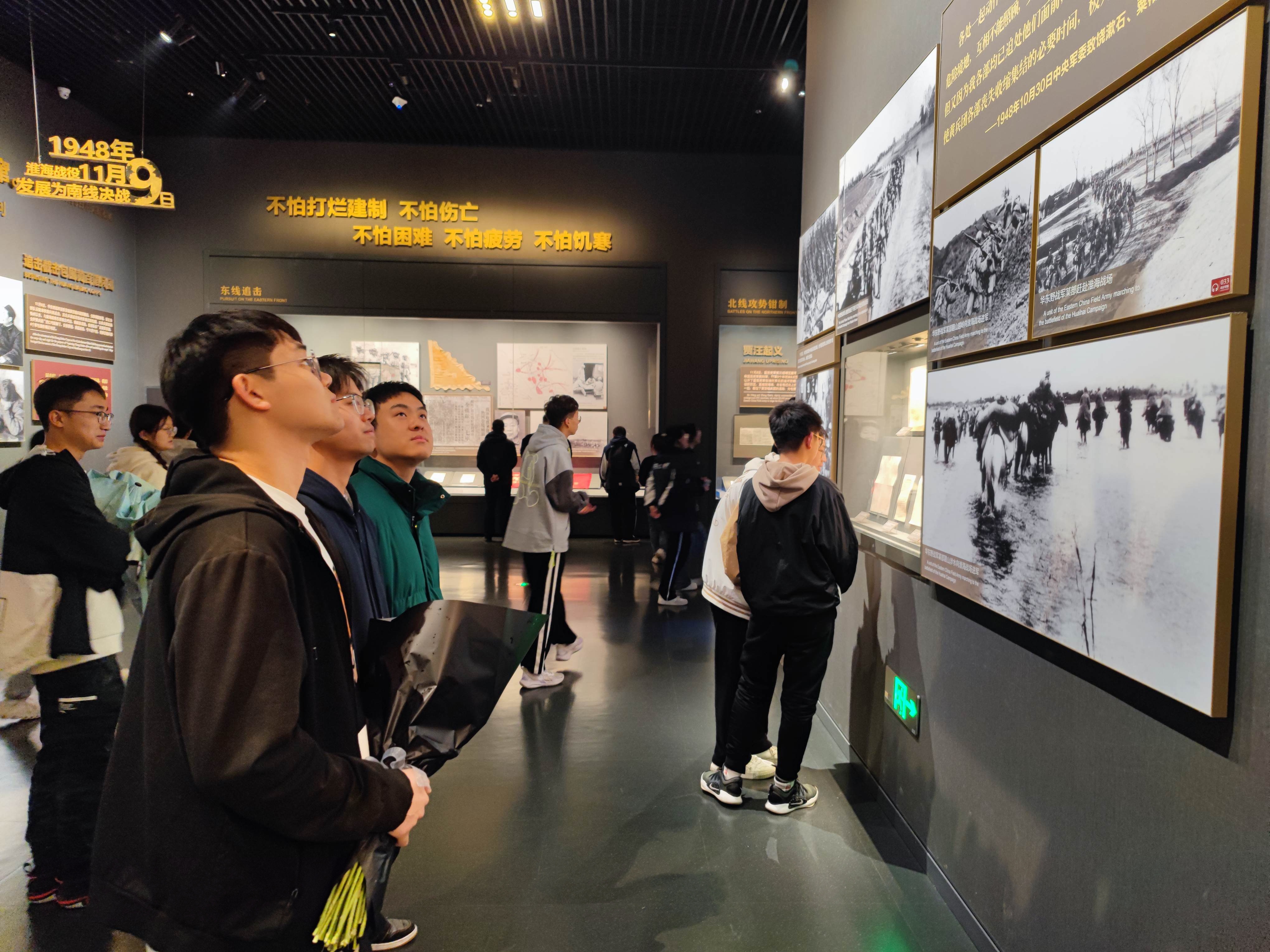 活动伊始,全体成员参观淮海战役纪念馆,室内陈列根据淮海战役战例设15个战争场景,结合板面、文物说明,描绘了气势恢弘的战争画卷,以现代化手段再现当年战争场景。离开纪念馆,同学们拾级而上,来到淮海战役烈士纪念塔,全体师生将手中的菊花敬放在塔前台阶表达追思,排成纵队依次缓步绕行淮海战役烈士纪念塔一周,瞻仰烈士纪念塔,庄严肃立,齐唱国歌。接着,李志仁同学念缅怀词,他引用司马迁说过的话:“人固有一死,或重于泰山,或轻于鸿毛。”悼念这些烈士们,他们的生命虽已逝去,但那可贵的、崇高的精神却像一团巨火燃烧着,永不熄灭。胡方余同学作为学生代表发言,鼓励同学们要自强奋发,当怀壮志,敢为先,争第一,做到“少年心事当拏云”的高尚品质。刘世通老师总结发言,他希望青年应有一往无前的奋斗姿态,更要有“一代更比一代强”的青春担当。活动最后,许正阳同学带领大家重温入党誓词。