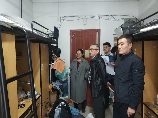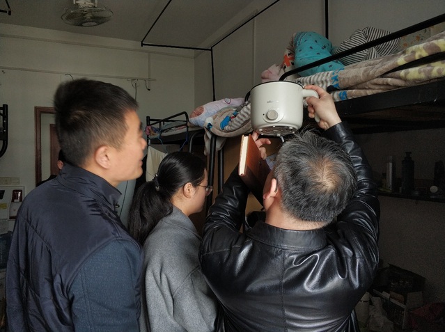 副院长朱晓东、学工班主任于基伯、研科办主任程婷婷及部分研究生会同学对研究生宿舍进行全面安全隐患排查,找出目前存在的问题,教育引导学生执行安全用电与宿舍卫生要求。