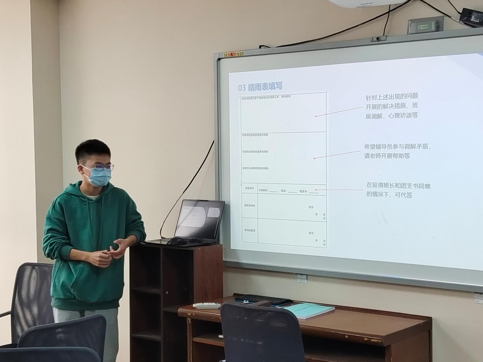 会议伊始,刘小毅向大家介绍了心理委员的职责及相关日常管理,帮助大家进一步明晰了工作内容和要求。接着,刘小毅着重讲解了晴雨表填写的工作事宜及心理委员工作意义所在,鼓励各班心理委员关注同学们的心理状态,及时为大家排忧解难。除此之外,他还就活动策划书写规范及注意要点做了细致地讲解,提升了心理委员的专业能力。培训最后,刘小毅介绍了心理委员的考核方式,要求22级各班心理委员联合班级干部共同组织开展班级心理健康主题班会。
