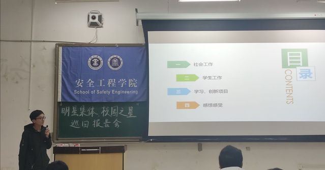 下午4时,报告会正式开始。四位校园之星和两位明星集体代表分别从不同的角度介绍了自己大学期间的收获和学习生活感悟。星级宿舍代表何胜介绍了宿舍成员优秀事迹及宿舍特色学习方式,并向同学们传授了宿舍内互帮互助,共同进步的方法。明星班集体代表王路宇从班级基本情况、班团学风建设、科研成果及特色活动四个方面展示了安全18-5班的风采,树立了模范班级的正确榜样。自强不息之星邵旭结合自身经历,用优异的成绩和丰硕的成果向同学们展现了自强不息的奋斗精神。学术科研之星李逸舟通过分享自身科研事迹,为同学们讲述了科研的意义和价值,激发了同学们对科研的兴趣。社会活动之星袁满为同学们讲述了他的学生工作历程,同时也指出并纠正了同学们关于学习工作的一些错误认知,引导同学们正确规划大学生活。学习优秀之星毛佳伟介绍了自己高效的学习方法,激励同学们以积极乐观、敢作敢为的态度投身到学习生活中去。