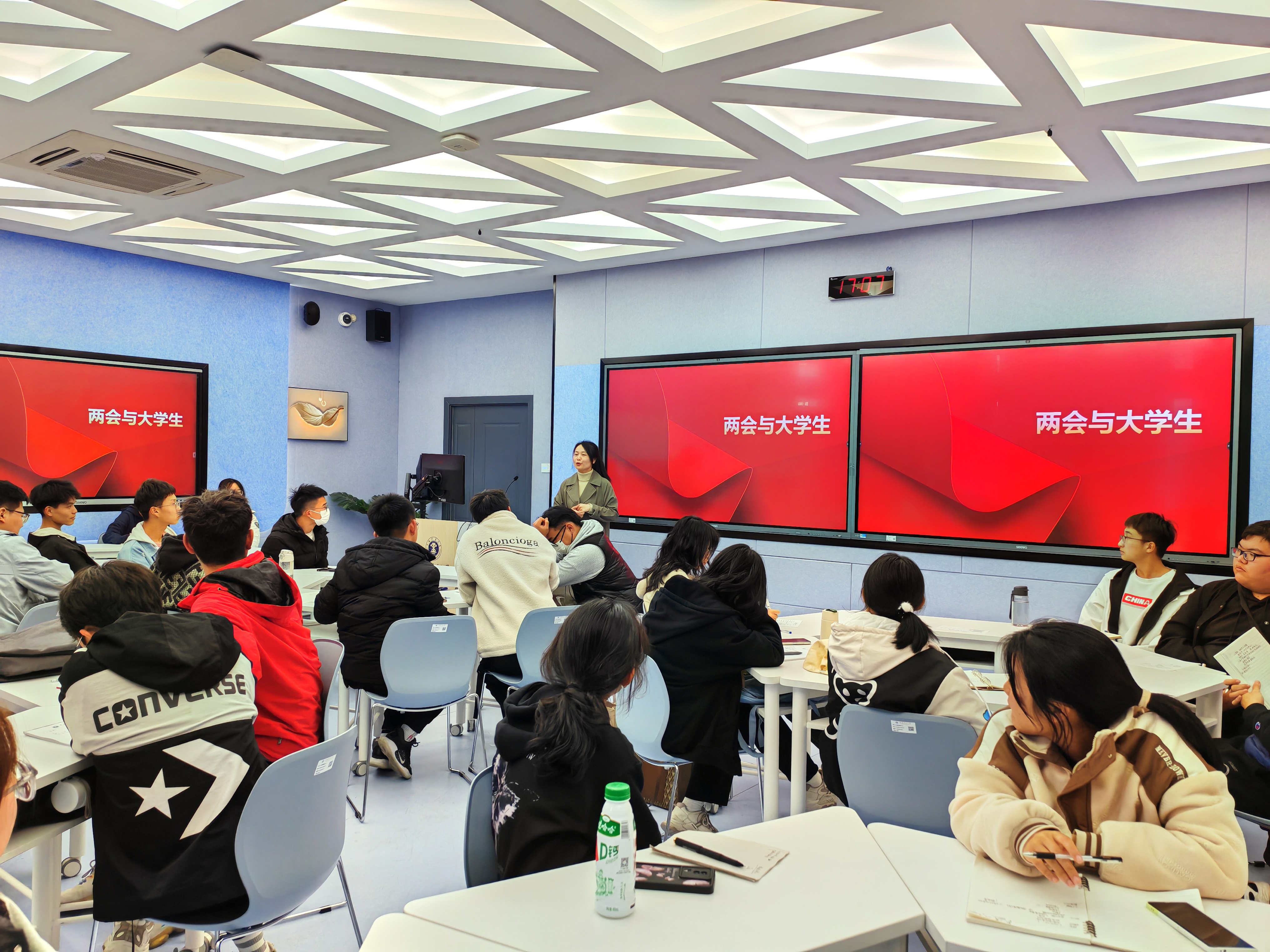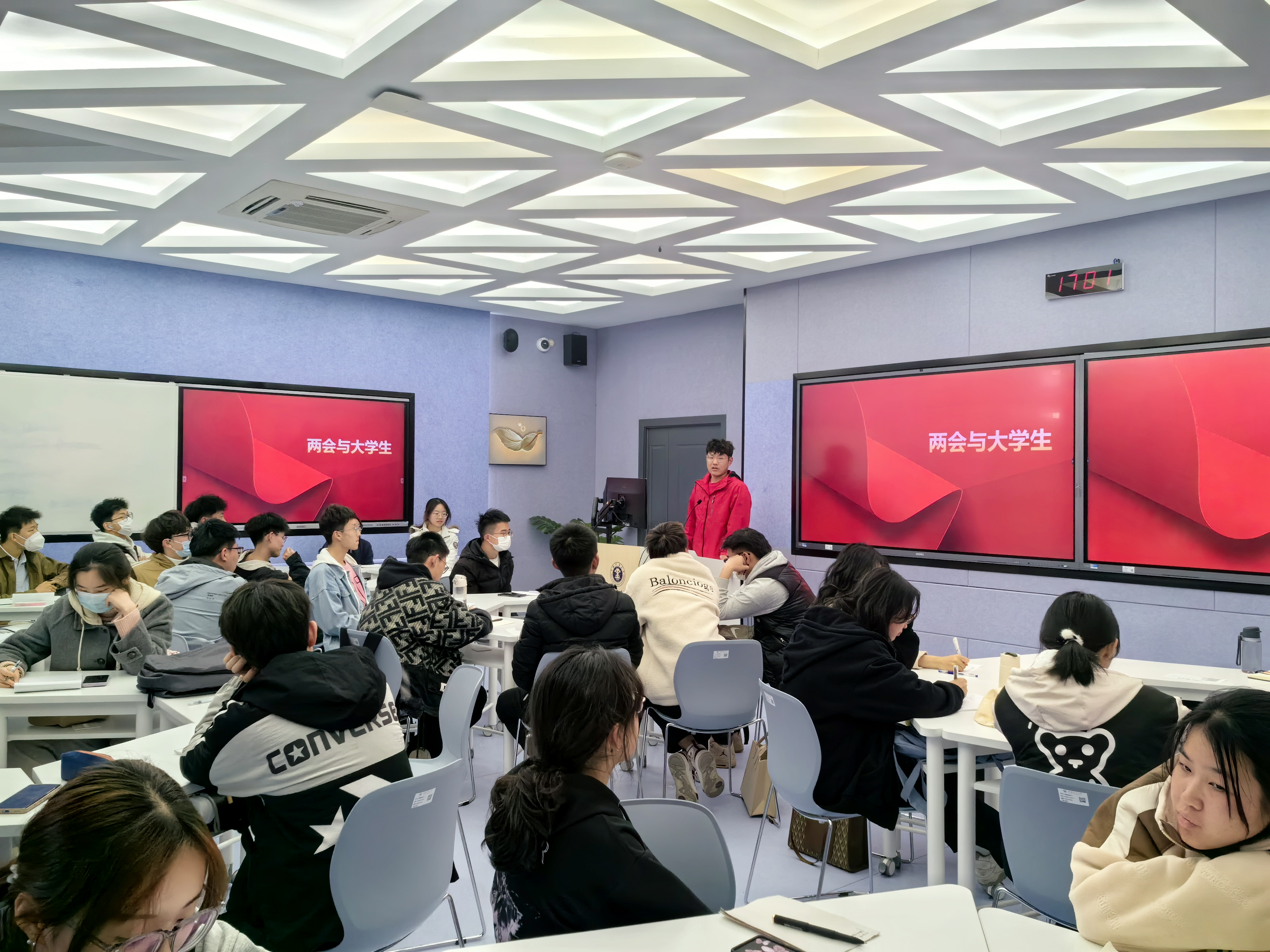 活动伊始,郭佳老师向大家介绍了本次活动主题和流程。首先,查次日乐特同学结合PPT带领大家就两会召开时间、内容、议程等十项内容进行解读,增强了同学们对两会的认识和了解;接着,温嘉琪同学就两会中的热点词汇,从就业、心理健康、考研、校园生活等与同学们息息相关的方面介绍两会提案,并倡议全体同学在关注两会的同学,要积极从“旁观者”向“参与者”转变,以主人翁的姿态做有担当有责任的新时代青年;随后,徐贵杨同学围绕“新质生产力”这一热点词汇,畅谈了自己关于大学生科技创新工作的认识。最后,郭佳老师从政府工作报告、“两会”重点新政策等四个方面向现场同学解读“两会学什么”,她说“两会”是全国各族人民正是生活中的大事,是大家了解国家发展大势、掌握新政策的“大课堂”,认真学习两会精神才能更好引导团员青年振奋精神、鼓足干劲,在两会精神中寻找成长成才的新方向,以奋斗者和担当者的姿态争做新时代新青年。现场同学也就学习情况进行交流。