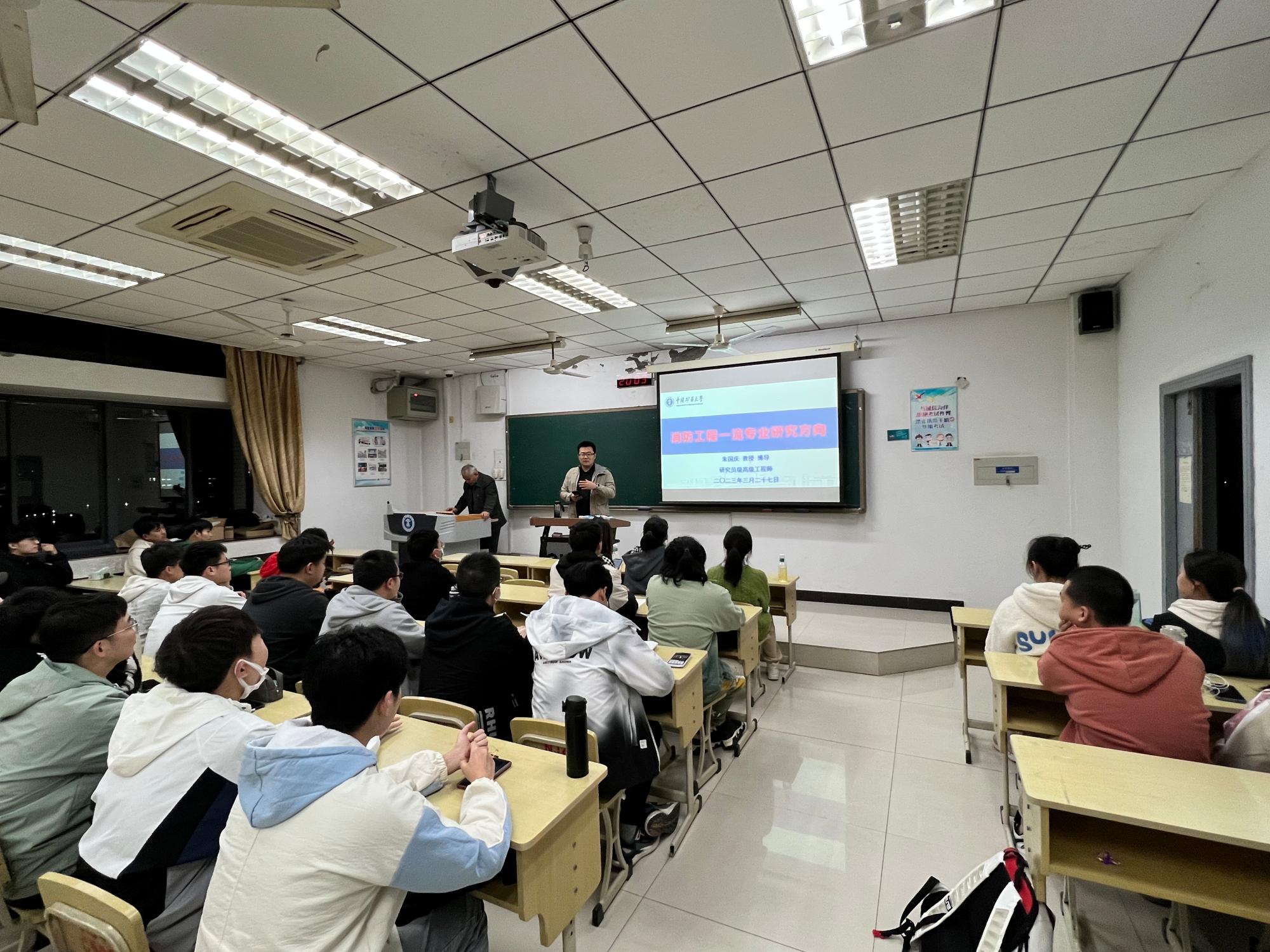 消防专业有关隧道与综合管廊火灾防护研究、大空间钢结构火灾坍塌与防护研究、薄型可燃物竖向燃烧与烟气蔓延研究、汽车火灾发展蔓延与防护研究、电动汽车充换电设施火灾预警及主动隔离处置技术、高效清洁气凝胶泡沫灭火剂及技术装备等多个方向进行了逐一介绍,提醒同学们要重视基础学科的学习,鼓励同学们要勇于尝试,摸索自己的兴趣方向,提高专业自信心。会议最后,朱教授解答了同学们对于毕业后就业、薪资及升上空间等多个问题,排解了同学们的疑惑与顾虑。