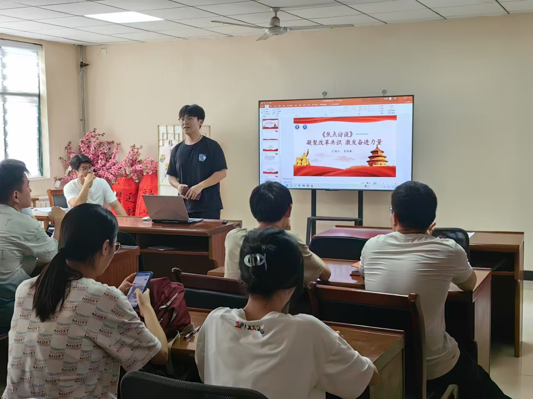 活动伊始,李孟阳介绍了本次活动内容与目的是深入贯彻学习党的二十届三中全会。随后,吴雨航和俞嘉濠分别从焦点访谈和习近平法治思想两个角度,将全会的精神与内涵科学严谨地带给参会者。李孟阳表示党的二十届三中全会是在民族复兴伟业的关键时期召开的一次非常重要的会议。李志仁也发表了自己的思想感悟,他充分接收了“改革不停顿、开放不止步”的强烈信号,并将以此为目标,努力前进。
