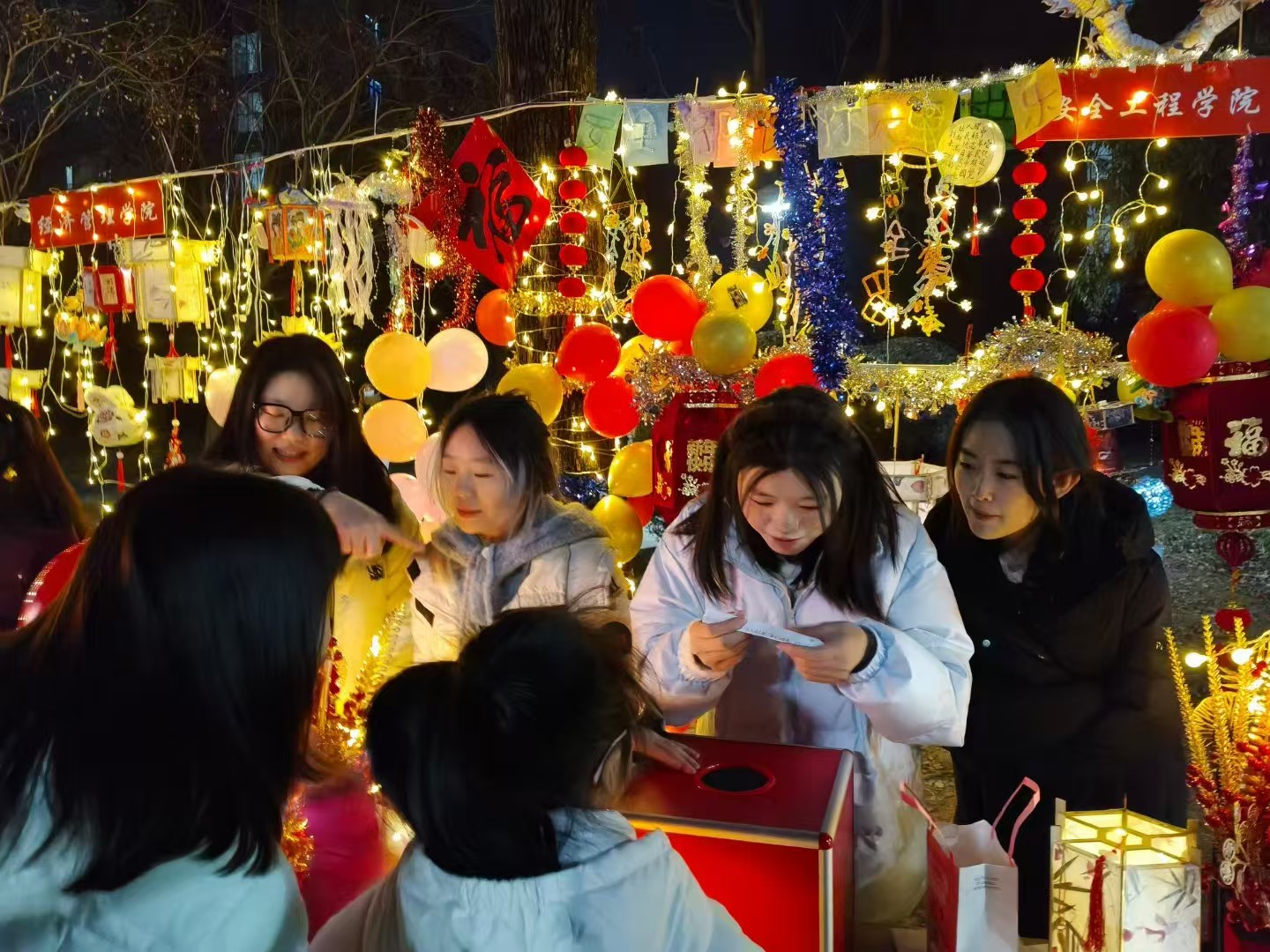 活动当天上午,志愿者们便早早来到场地,有条不紊地进行布置。气球、彩带、剪纸等装饰品将现场装点得年味十足,洋溢着喜庆的氛围。灯展现场,污污漫画同学们手工制作的各式花灯,现场还有猜灯谜活动,充分展了对中华优秀传统文化的传承与发扬,还有对新年的热切祝福和美好期盼。游艺宫现场,精心设计了迎新春·剪纸韵、听声识音、笔下生趣·你画我猜等一系列共12款活动环节。喜庆的装饰、有趣的游戏吸引大家跃跃欲试,套圈、你画我猜、步步高升等游戏更是让大家赞口不绝,剪纸、书法、等传统文化符号点缀其中,琳琅的奖品让大家满载收获和欢乐而归。活动现场气氛热烈,其乐融融。