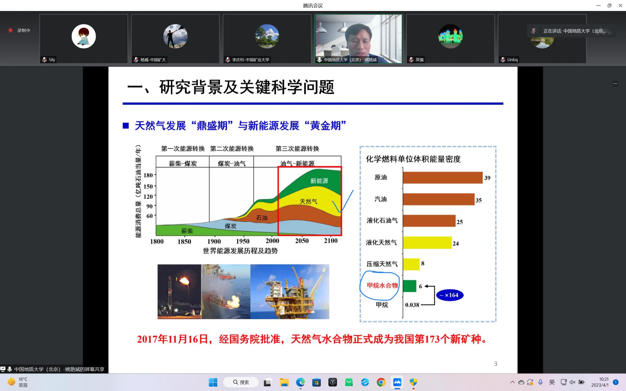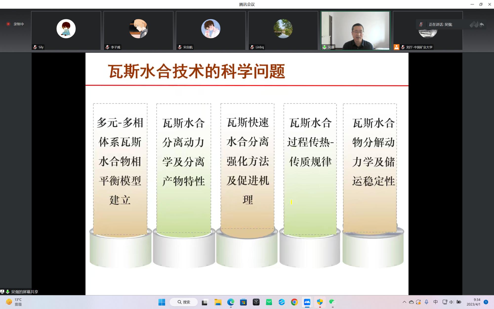 活动伊始,吴强教授以《瓦斯水合技术应用前景及研究进展》为题进行分享。吴教授从瓦斯防治和利用的战略需求、气体损耗的简介、瓦斯水合技术研究进展三部分对国家的煤矿开采进行了简单分析,介绍了瓦斯水合技术的研发背景。接着吴教授向大家简单介绍了气体水合技术以及三个典型的瓦斯固化技术应用领域并以自己的研究项目为例,展示瓦斯水合技术研究现阶段进展。姚艳斌教授以《细粒水合物储层降压开发诱导的渗透压动态变化预测》为主题分享研究背景与关键性科学问题、储层孔隙结构及流体赋存运移规律认识、水合物分解效应渗透率变化规律及预测、降压开采过程多效应耦合的渗透率变化预测四个方面。姚教授从能源发展的各个时期,世界天然气水合物资源分布,水合物降压开发过程渗透率影响因素三方面介绍了相关背景和科学问题。随后姚教授展示了一些有关水合物的调研及实验数据,建立了一些相关模型来分析水合物分解效应渗透率变化规律及预测。报告最后吴教授、姚教授就大家提出的问题细致解答。