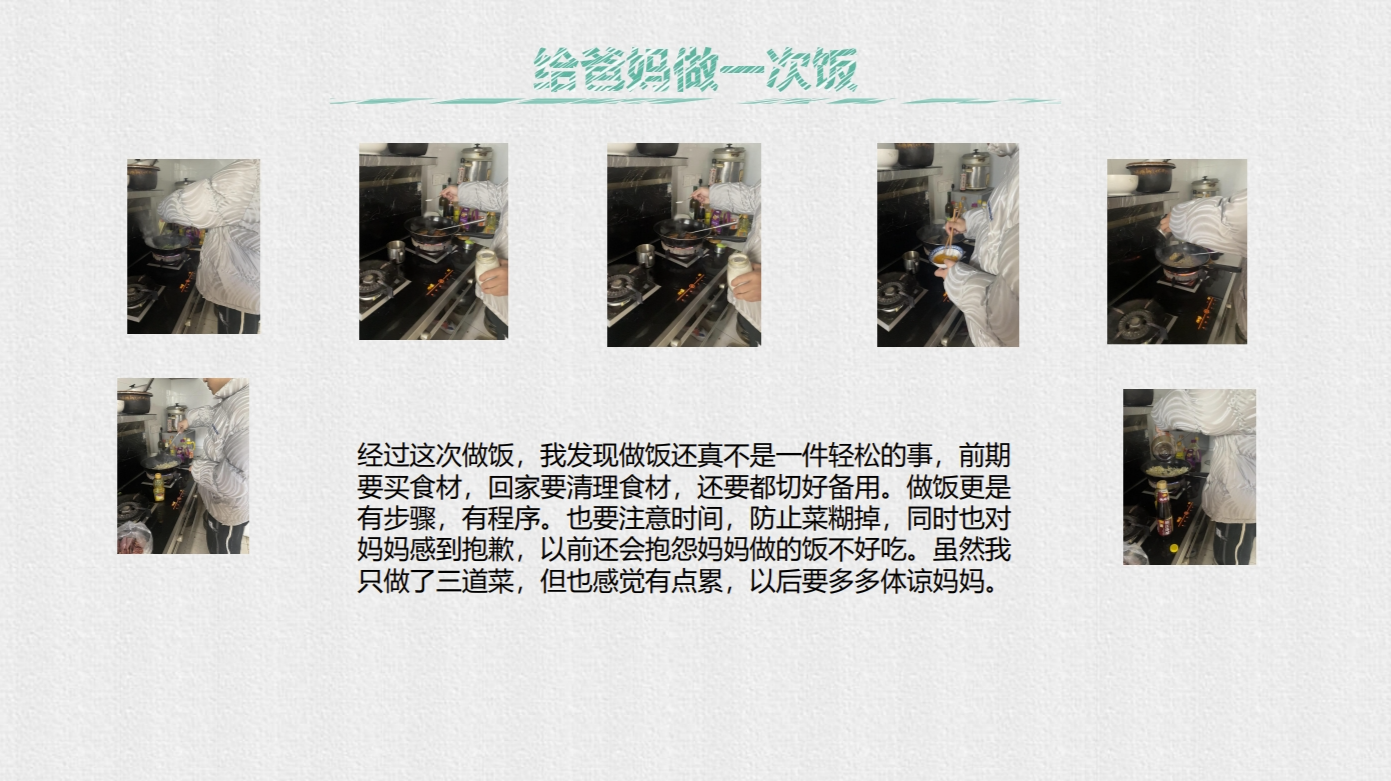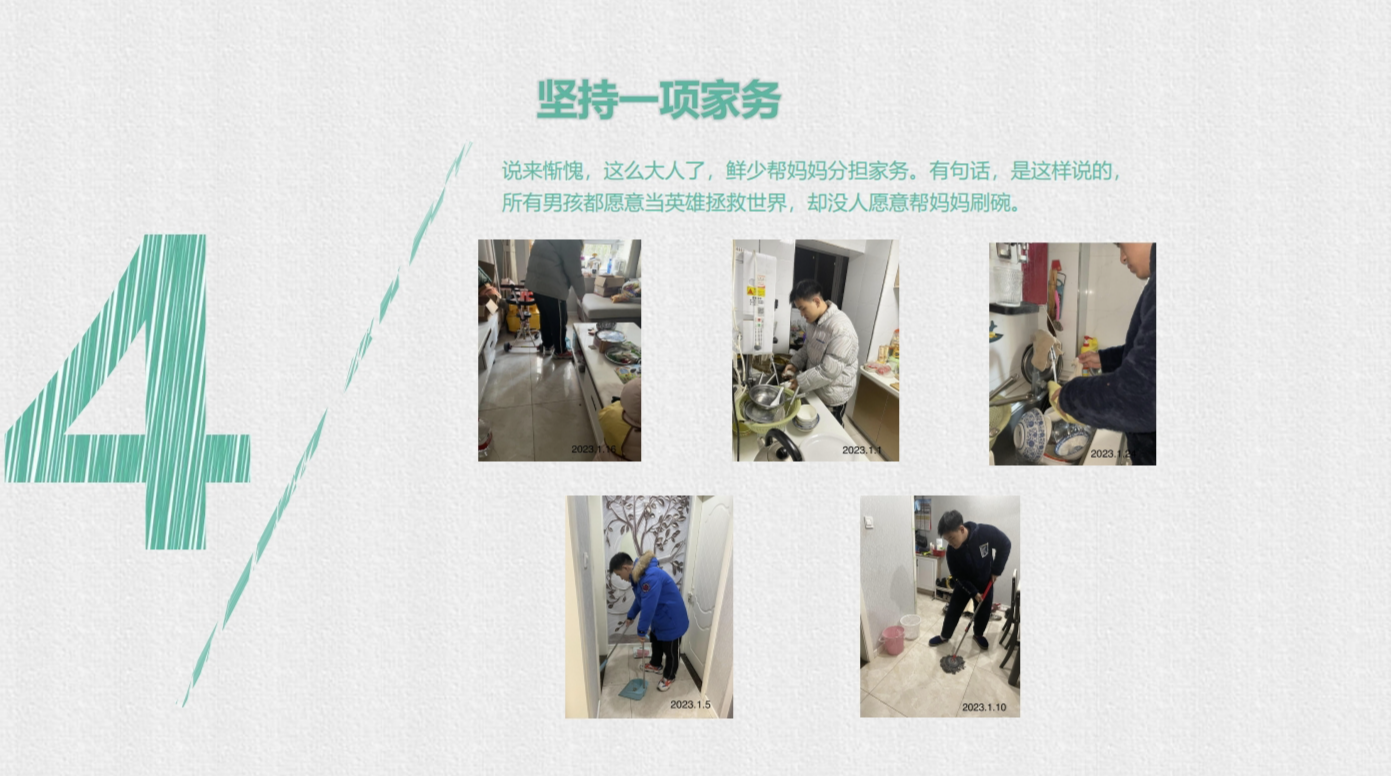 本次活动围绕家务、运动、读书、家人、厨艺等五个方面,不仅帮助同学们度过一个充实而有意义的寒假,增进了家庭成员间的感情,同时培养了自律意识、责任意识和积极向上的心态,提升了同学们的综合素质,有助于学生的个人成长。