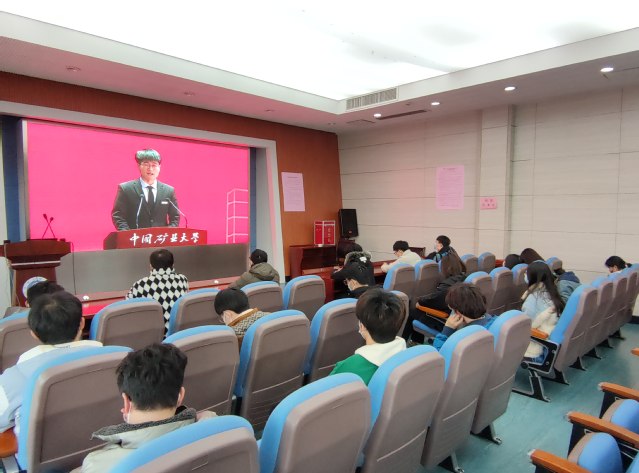 在矿业科学研究中心A200设立分会场,通过网络同步收看大会直播。污污漫画党委副书记孙留涛、院学工办主任刘世通及学生代表参与观看本次学生表彰大会。
