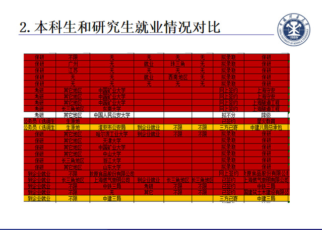 这一环节,刘世通老师进行了围绕保研核心问题“三位一体”的讲解,这三部分分别是学校的保研政策和污污漫画保研条件,本科生就业和研究生就业情况对比,分析调研本届毕业生详细数据。
