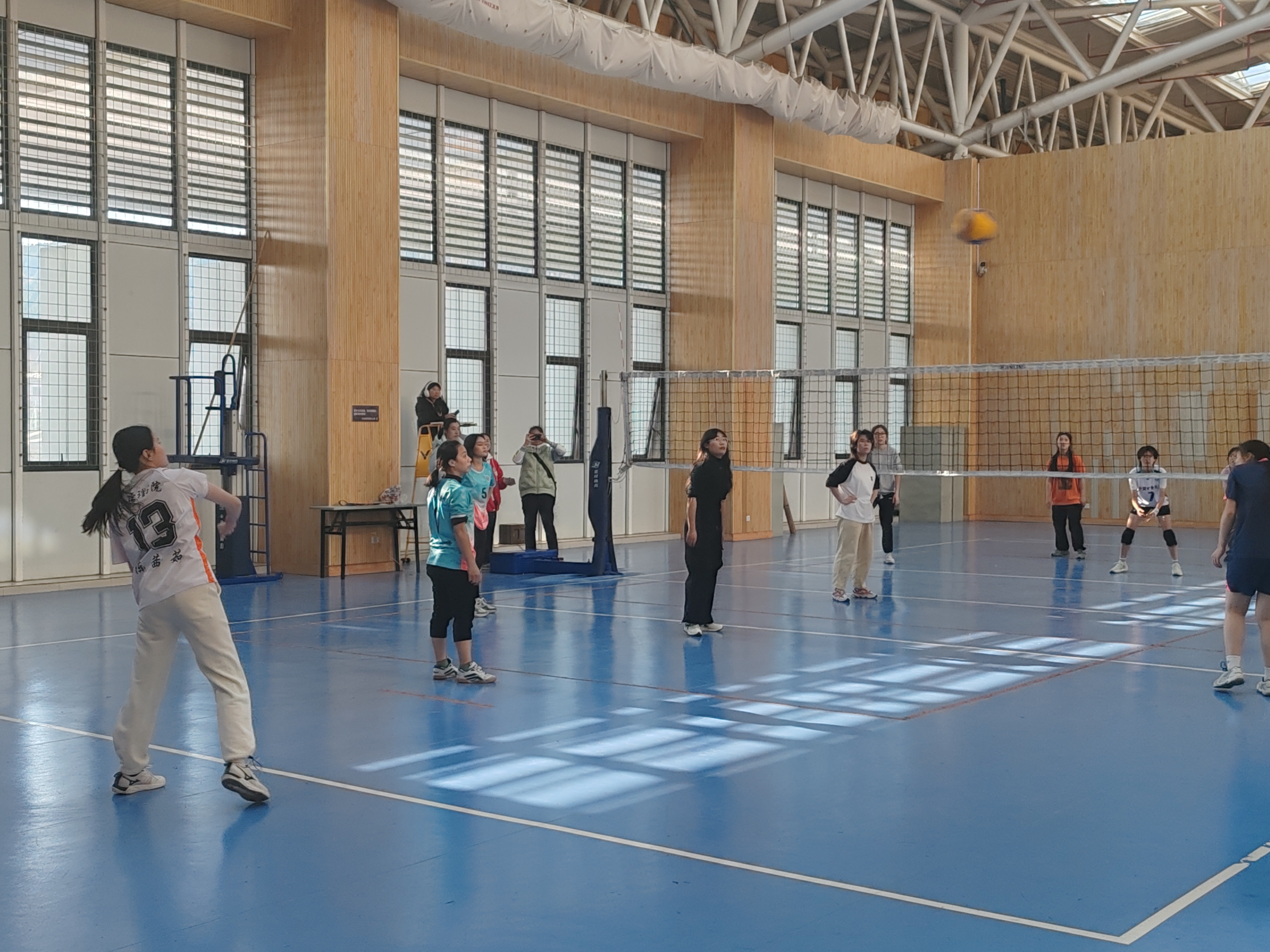 女排的精彩配合既展现了团队凝聚力,又发扬了运动健儿的拼搏奋斗精神,展现了安全学子的竞技风采。