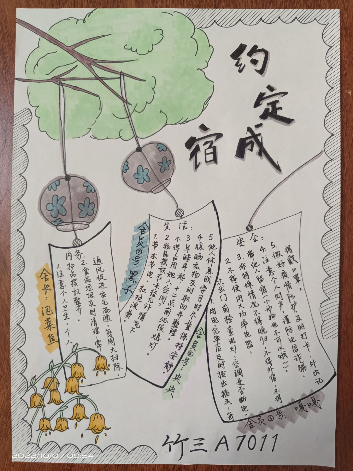 活动初期,通过线上平台进行了宿舍公约设计比赛的活动宣传,参赛的同学以小寝的单位共同绘制宿舍公约手抄报,用自己独特的表达方式,将舍风、学风、卫生、作息、生活习惯等有关优良文化的宿舍公约一笔一墨地浸透在纸上。活动后期,针对参赛同学的手抄报照片以及寝室的合照照片进行活动的评比。参赛同学纷纷表示通过参加宿舍公约设计大赛,加强了本宿舍之间的合作交流,同时可以通过公约的方式妥善处理宿舍相处问题,有利于室友之间和谐相处。