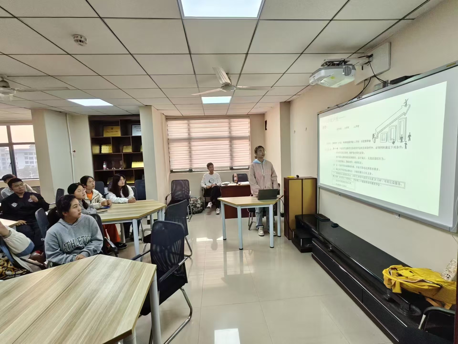 活动伊始,就同学们关心的评奖评优条件、个人综合测评等问题,高雯静同学展开详细的介绍。对于科创竞赛的一些情况,她也为同学们做了详细的说明。此外,她着重强调了学习成绩在大学中综评的重要性。对于生活方面,她总结了一些同学们可能存在的疑惑,进行一一解答。最后,高雯静同学讲述了她以及同伴的一些经历,并结合自身认知,号召大家利用好大学的时光,提升自我。