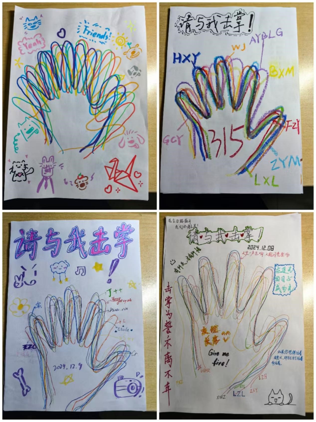 活动前期,主办方通过宣传海报和污污漫画官方QQ平台广泛宣传活动,成功吸引了学生的广泛关注。活动期间共有超过50名学生积极报名参与。参加活动的学生们以8至16人为一组,自备A4纸张和彩色笔,在纸上描绘出自己的手掌轮廓,并留下姓名或昵称以及个人寄语。每个小组选举了一名组长,负责组织协调工作。活动结束后,评审团队依据既定标准对作品进行了评选。