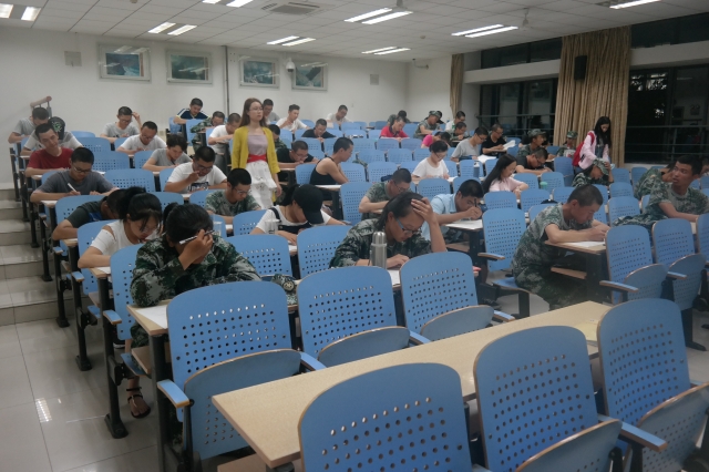 晚上六点十五,新生提前十五分钟进入教室等待考试开始。第一场考试是廉洁文化知识测试,考试时间90分钟,闭卷考试,主要是对《大学生廉洁文化知识读本》内容的考察分析。第二场新生入学教育考试,开卷考试,是对新生手册内容的考察。考试过程中,同学们自觉遵守考试纪律。监考人员也尽职尽责,严格要求,严格监督。三个考场中,同学们都安静答题,表现良好。