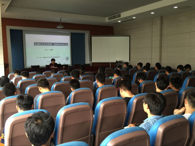 本次讲座共分五部分,分别是压力的概念,压力的意义,压力测试,压力管理ABC和生活的幸福之道。讲座开始后,范老师首先用两幅心理学周边漂移错觉的图形与在场研究生互动,引出了压力的概念,即压力是环境要求你做出选择或改变时的个人感受以及对未知事件悲观解释的结果,又引用了研究生生活中的例子说明了压力是持续不断的精力消耗,压力事件主要分为创伤性事件、耗竭性事件、烦恼性事件、紧张性事件。阐释了压力是什么后,范老师展示了针对我校研究生的压力小调查,结果表明研究生目前所面临的心理压力主要有学业压力、择业就业和现实目标。随后,范老师从正反两方面说明了压力的意义,讲解了短期压力、长期压力与表现的关系,并展示了一份压力测试题,生动形象地把压力对人的影响展现出来。在第四部分压力管理ABC中,范老师以十八只狐狸的寓言为引子,介绍了压力管理的三大策略:直面问题、转换观念、自我训练。详细地向同学们说明了如何管理压力,积极面对困难。最后,范老师结合自身情况,向大家讲解了生活的幸福之道,告诉大家生活中要常有积极的视角、爱的语言,并应常怀感恩之心、放松之心。精彩的讲座赢得同学们阵阵掌声。