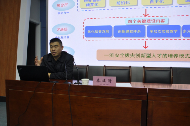 秦波涛教授主要从三个方面讲述了如何培养一流本科生创新新型人才。一是强化“以学生为中心”的人才培养理念,贯彻“学训融创”,以科研成果为基础,实时动态丰富教学资源,教学结构渗透创新教育。二是构建自主研创实验和国际化实验教学体系,践行“寓教于研”的重要性,他通过安全污污漫画与肯塔基大学、卧龙岗大学等合作共建实验基地以及安全污污漫画2个国家级实验教育中心举例,讲述了实践教学的具体方法。三是着力打造一流师资队伍来实现一流安全拔尖创新人才的培养模式和全方位保障体系。之后,秦教授向在座的同学们提出了三点思考,并详细讲解了自己的看法,获得了大家的一致认同。参加此次讲座同学纷纷表示,聆听秦波涛教授的讲座收获颇丰,明确了日后学习的要点和努力方向。