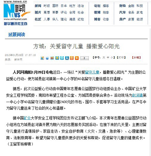 颁奖典礼不仅播放了有关王鹏飞团队关爱留守儿童公益活动的宣传视频,让全校师生了解了他们感恩社会,回馈家乡的优秀事迹。主持人还现场对其进行了专门采访。2013年1月、7月、8月,他带领20人公益团队利用所学专业知识为留守儿童讲解安全自护及法律等知识,教授他们如何自我保护。他们跋山涉水,走访了520余名留守儿童家庭和150余名空巢老人家庭。王鹏飞同学用自己的实际行动,唤醒了许许多多留守儿童内心的希望,当儿童的心中再一次点燃爱的火光时,他们便不会孤单,勇敢面对生活,追求自己的梦想。王鹏飞同学及其团队克服困难,甘于奉献,在志愿服务中实现了青春价值,更向社会展现了矿大安全学子的风采!
