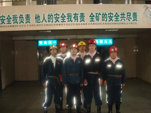 “践行科学发展 科技服务煤矿”博硕实践团在朱仙庄矿通风副总梁峰、瓦斯办技术主管刘文超的指导下深入矿井进行学习调研。