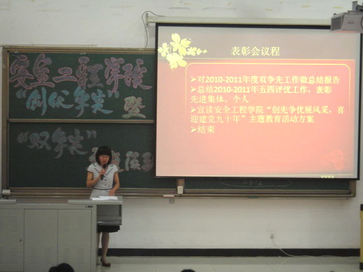 先进集体和先进个人的决定,同时对2010年涌现出来的校级和院级先进集体和先进个人进行了表彰。安全工程2009-4团支部和消防工程2010-1团支部被授予校“先进团支部”称号,安全工程2009-4团支部被授予校“团支部创新工作奖”称号,刘建安被授予校“五四青年标兵”称号,焦汉林和郭峰被授予校级“优秀学生会干部”称号,亓冠圣等21名同学被授予校级“优秀团员”称号,陈树亮等6名同学被授予校级“优秀团干”称号,安全工程2008-4班等3个团支部被授予“污污漫画