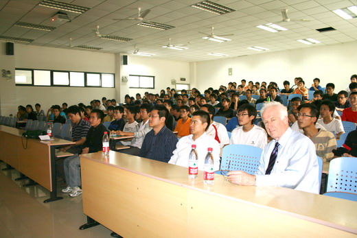 Gillies教授首先向大家展示了一款软件,他介绍,该软件能模拟矿井中发生火灾后,在特定时间内火的的走法、分流以及由于火灾产生的一氧化碳等有毒气体的走向。同时这款软件还能模拟井下作业人最佳逃生路线,矿井中温度随时间的变化等等。随后,他更幽默的提及了煤层的各种开采方法,引来全场阵阵掌声。考虑到大家可能不能很快适应外语教学,田教授主动当起了现场翻译,令同学们体验到了一场别开生面的学术报告会。
