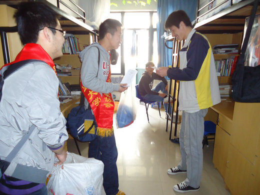 梅三宿舍,开始了对爱心宿舍废弃物品的回收活动。敲开爱心宿舍的门,宿舍内的同学以灿烂的微笑欢迎青协同学的到来,并主动将积存的废旧书报和矿泉水瓶等整理好递到青协同学的手中。青协同学手握塑料袋,将手中的感谢信递与爱心宿舍成员,感谢其无偿的捐献。捐赠物品买卖现金后,善款将汇至扶贫基金会,以“爱心包裹”的形式帮助贫困地区小学生,从而进行环保助学活动。本次爱心宿舍回收活动历时一小时后圆满结束。