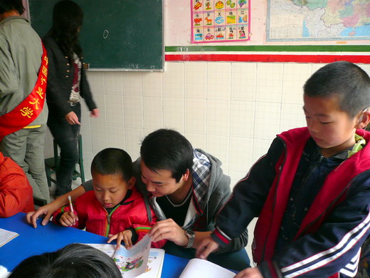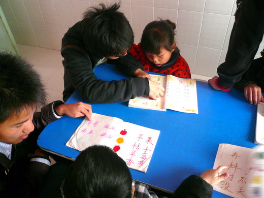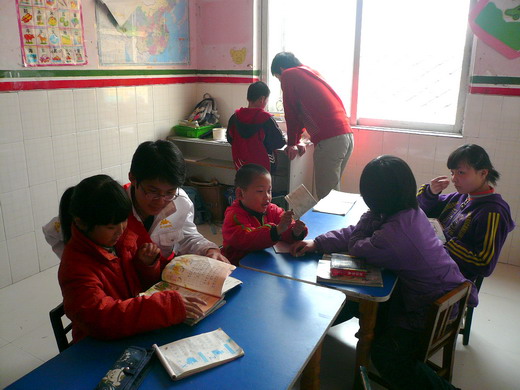 在老师的带领下,队员们分成了两组,走进不同的班级开始一对一辅助教学。孩子们个个带着助听器,在努力地发准每一个汉字的读音。虽然语言沟通上有一定的困难,但在同学们热情的带领下,孩子们练发音、写生字、听写、朗读,场面热闹而温馨。尽管孩子们的发音有点艰涩,书写有点歪斜,但他们勤学的精神感染了在场的每一个人。11:30,同学们依依不舍地与孩子们挥手告别。