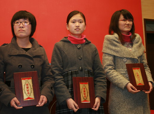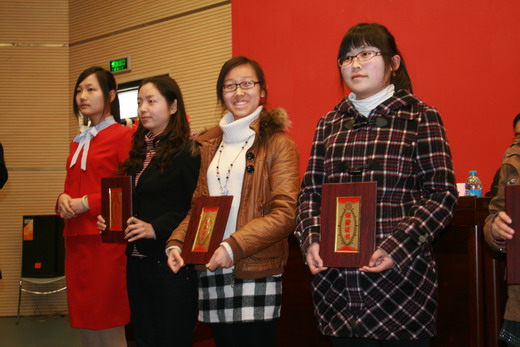 李秀老师荣获校“先进妇女工作者”荣誉称号;樊秀娟老师荣获“妇女工作积极分子”称号;张丹获得校“十佳女大学生”、唐玉华获得校“优秀女学生干部”荣誉称号。主席台领导分别向受到表彰个人颁奖。