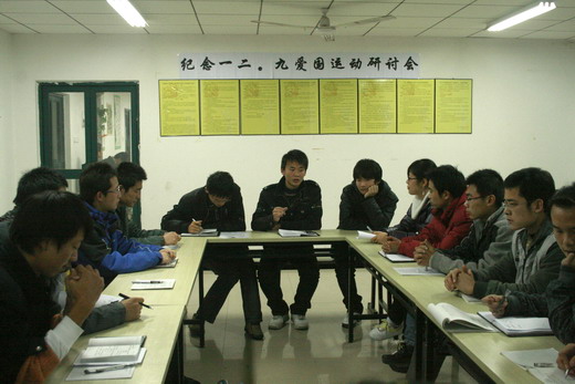 会议于九点十五分正式开始。伏旭首先向在座各位简单介绍了一二·九运动的背景、过程和重要意义,鼓励大家积极发掘其深层次意义,努力向前辈们学习可贵的爱国精神。他分别从爱国运动和青年责任两个方面进行阐述,讲解了自己对一二·九运动的认识。他引用了奥运火炬传递期间徐州出现的抵制家乐福等事件,指出大学生应当理性爱国,并提出“三思而后行”、“以国家利益为重”、“丰富自己技能,实现个人价值”和“心怀感恩”四点要求。接下来,与会人员纷纷积极发表各自的看法,结合污污漫画发展现状、学生学习状态和学生 会发展问题,指出了一二·九运动的现实意义,力争在全院形成弘扬爱国精神的良好风气。