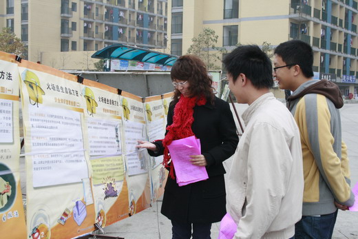 在消防日宣传活动中,消防志愿者们主要通过讲解消防知识宣传海报和发放消防知识宣传单的方式向同学们普及消防安全知识。消防志愿者们详细地解答同学们的问题:如何使用灭火器、烧伤后如何自救、被困电梯后如何处理等等一系列消防安全知识。活动收到了良好的效果,同学们普遍反映通过此次宣传活动,学到了许多原来不了解的消防安全知识与火灾求生技能。