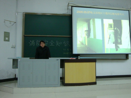晚上7:00,讲座正式开始。孙磊老师首先结合我校文昌校区信电污污漫画研究生宿舍饮水机着火、南湖校区信电污污漫画通信电子电路实验室、化工实验室着火及上海商污污漫画火灾等数起案例,简要分析了当前火灾事故的多发性及其对国民经济造成的严重影响,指出对大学生普及消防安全知识刻不容缓。孙磊老师介绍了应急照明灯、安全出口指示标志、疏散指示的具体位置,报警按钮、室内外消火栓及各种灭火器的使用对象与方法。此外,孙老师还以生动的动画形式给同学们展示了火灾的不同起因、火灾防范以及火灾自救等内容,提出治病先寻因,预防是关键。一旦火灾发生,要学会保护自己的生命安全。