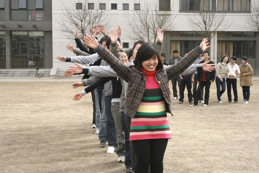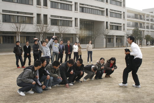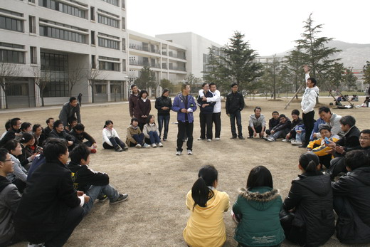 第一项活动是“抓乌龟”,所有同学围成一个大圈,每位同学把自己的右手食指抵住右边同学的左手掌,每次主持人说到安全两字时,一位同学的手掌尽量抓住另一位同学的手指,被抓的同学要做一件事。第一项活动集中了成员注意力,活跃了现场气氛。随后是“同舟共济”与“穿越障碍物”,所有同学根据拿到的纸片颜色分成四个小组并在规定时间内确定队长、队歌、口号与情景剧,然后向大家展示。在前一个环节中,每个小组有五位同学站在报纸上剩余的同学抢答问题,如若一个小组答对其余小组的报纸都要被裁剪,如若抢答的小组答错本小组的报纸则被裁剪,直至报纸不能容纳五人。后一个环节需要每个小组推举同学蒙眼穿越障碍物小组,剩余同学在旁指导。活动中大家相互配合,加强团结,打破了性别的界限,增强了合作精神与默契程度。