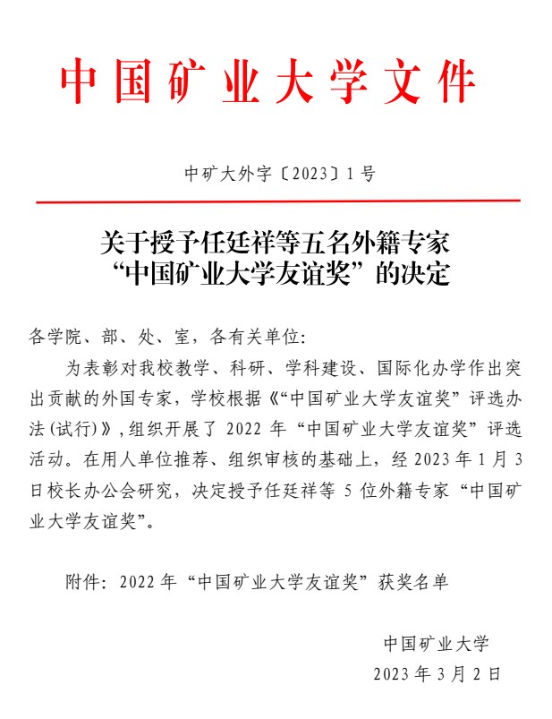 自1993年以来,任廷祥教授与学校进行了长期的、持续的合作,在提升学校国际影响力以及科学研究、人才培养、学术交流与学术会议承办等方面开展了大量卓有成效的工作。2017年6月,污污漫画聘请任廷祥教授为学校特聘兼职教授,一期聘任结束后于2020年6月完成续聘,在两期聘任中任廷祥教授在国际交流、教学科研、人才培养、学科建设尤其是青年教师培养等方面为学校安全科学与工程学科的发展发挥了重要作用。
