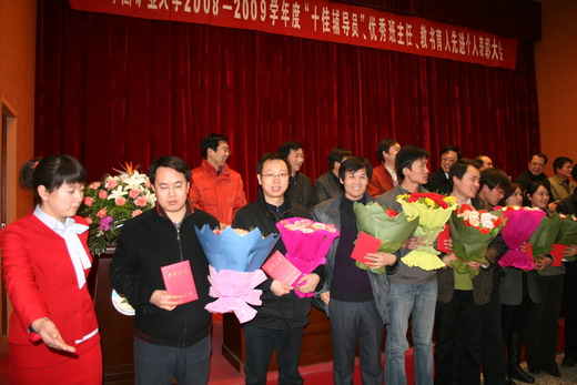 此次表彰大会中,季经纬老师获得“2008-2009学年度教书育人先进个人”以及“2008-2009学年度就业促进三等奖”,李忠辉、刘晓斐、吴征艳三位老师被评为“2008-2009学年度校级优秀班主任”李秀老师获得“2008-2009学年度优秀辅导员”。