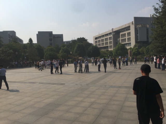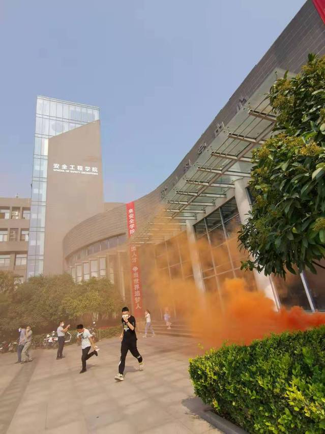14:10,模拟火情扩大开展紧急疏散。工作人员在楼内用发烟罐释放烟雾模拟火灾,同时打开报警装置。随着“火灾”警哨声的响起,各楼层疏散引导员按预设消防演练活动方案迅速到位,大喊“火警,马上撤离!”,引导参加演练的师生用毛巾沾水捂住口鼻,沿着各个逃生楼道有序下楼,并到达指定安全位置。