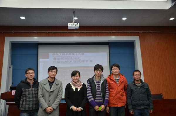 在经过主持人李俊毅的简短介绍后,来自2012级的研究生李浩威、韩宗建、蔡维维、谢兵兵、戴韬、焦汉林分别就各自的研究领域做了相关学术报告。首先由李浩威与大家分享他的研究成果,报告题目是“应用均衡通风原理优化矿井通风系统”,在他的报告中,以运河煤矿为例,结合均衡通风原理,向大家介绍了煤矿风网解算系统的设计与现状模拟研究。随后韩宗建向大家讲述了 “贵州马依西煤矿北风井揭煤防突技术研究”,介绍了如何将FLAC-3D软件应用在揭煤工作面上,同时介绍了渐进式揭煤方法在北风井的运用。蔡维维的报告题目是“薄型可燃物竖向燃烧实验与数值模拟研究”,她结合竖向燃烧火灾实验和数值模拟研究了薄型可燃物竖向燃烧规律。谢兵兵、戴韬和焦汉林的报告主题分别为“矿井通风自修复监测分析研究及应用”、“真实非均质岩石细观数值模型建立方法”和“初采期瓦斯涌出规律及治理技术研究”。