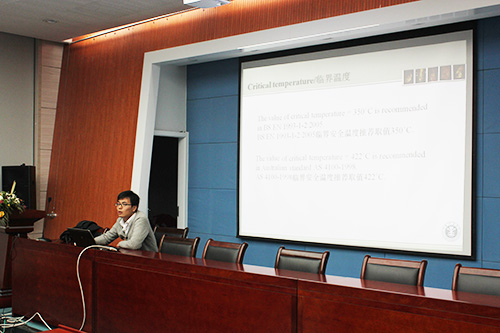 最后,朱国庆教授课题组的张国维博士给大家带来了关于“大空间钢结构性能化防火设计”的报告。张国维博士以建筑的美观、经济与安全之间的矛盾开场,从临界安全温度、高大空间钢结构升温修正模型、实验验证等三个方面入手,并结合徐州音乐厅的实际工程案例,对所研究课题的内容体系和创新点作了较为深入的解析,让在座同学们对消防工程领域有了新的认识。