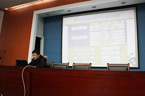 会上,首先给大家做报告的是程远平教授课题组的安丰华博士。他针对自己的研究课题“煤与瓦斯突出孕育过程机理模拟及应用研究”进行了讲解,分别介绍了该课题的立项背景、主要内容以及应用研究等方面内容,并对煤与瓦斯突出机理及数值模型、煤与瓦斯突出过程四个阶段、煤体力学特性等发表了自己的看法,让大家对煤与瓦斯突出孕育过程机理有了进一步的认识。