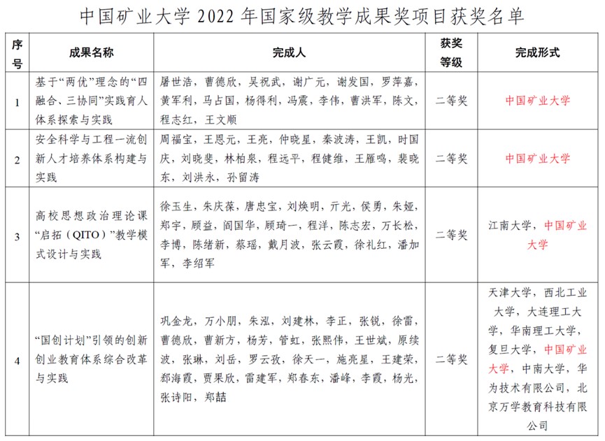 教师作为主要完成人的《安全科学与工程一流创新人才培养体系构建与实践》成果奖项目获高等教育国家级教学成果二等奖。