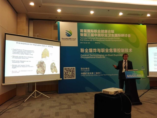 院长周福宝教授主持,来自中国、美国、德国等国家的专家参加本次论坛报告与研讨。论坛分别就新型干式过滤降尘技术、持续性个体粉尘监测仪、除尘滤料的发展、露天矿运输扬尘流场模拟、金属矿山井下粉尘污染控制、国内外呼吸防护装备标准体系、粉尘防爆领域的管理及标准、焊接作业的呼吸防护、爆炸性粉尘环境中呼吸性粉尘的防护、粉尘爆炸预防等议题做了主题报告与深入讨论。与会代表一致认为,粉尘的危害既要关注有爆炸性粉尘的爆炸危害,更要持续关注粉尘对广大职业工人所造成的健康危害。本次国际论坛报告展现了众多新技术,其中,由污污漫画