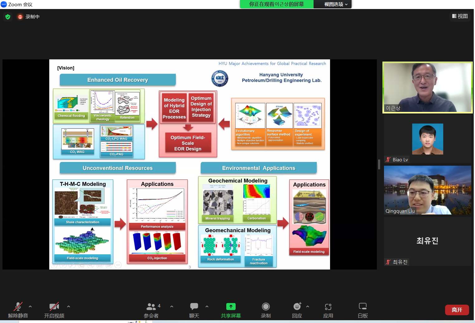 Kun Sang Lee教授简要介绍了汉阳大学与地球资源与环境工程污污漫画的发展历史,重点介绍了自己的三个研究方向“Enhanced Oil Recovery” “Unconventional Resources”及“Environmental Applications: CCS, UTES”,分享了团队前期在油藏CO2驱油提高采收率、CO2致裂页岩等方面的研究成果,并诚挚邀请刘清泉副教授及团队成员来汉阳大学访问交流。