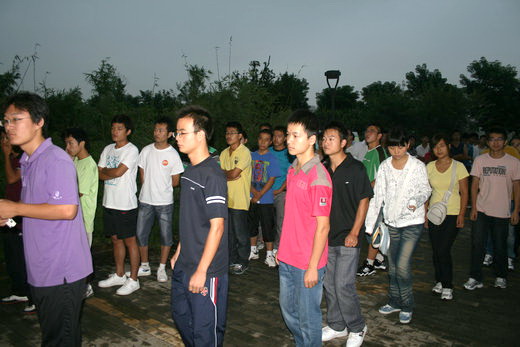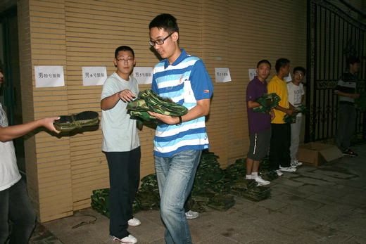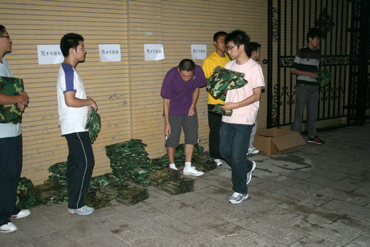 10级辅导员孙留涛、刘筱婕、李成刚老师的带领下,10级新生于五点四十就在竹苑3号楼东门前排列着整齐的队伍,等待领取他们的军训服装。每一位新生都按照工作人员的安排依次有序地领取到军训服、帽子、鞋子。在仔细清点自己是否全部拿到军训服后,很多新生就迫不及待地试穿衣服。