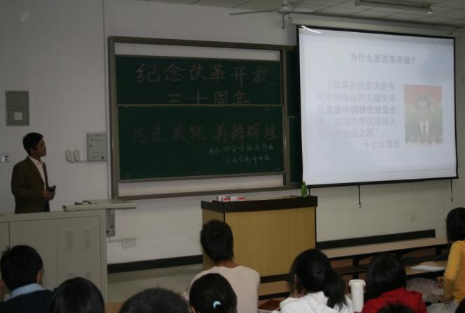 自1978年改革开放以来,我国发生了翻天覆地的变化,国家的经济实力显著增强、人民的生活水平普遍提高。为纪念改革开放三十周年,由校团委主办、安全污污漫画知行社与文法污污漫画邓研社联合承办的“感受成就,再铸辉煌”讲座于4月28日在教二B-102举行。此次讲座诚邀文法污污漫画“两课”教研社聂继永老师主讲。