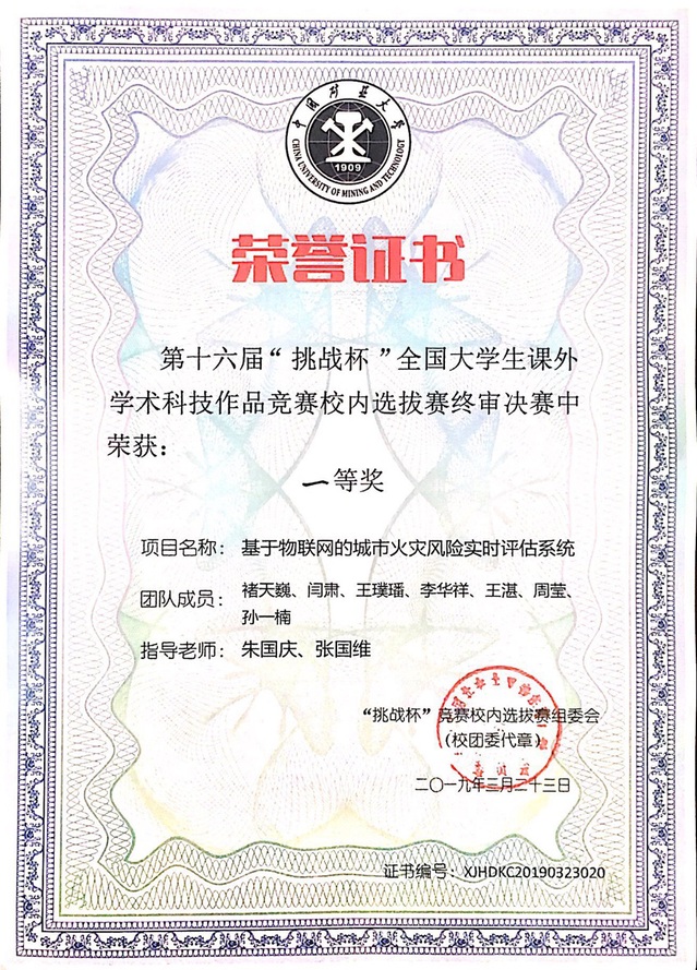 1、褚天巍团队“基于物联网的城市火灾风险实时评估系统”项目,指导教师:朱国庆、张国维。