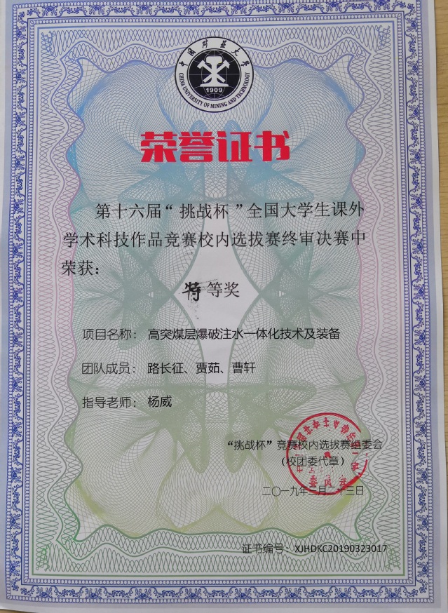 4、路长征团队“高突煤层爆破注水一体化技术及装备”项目,指导教师:杨威。