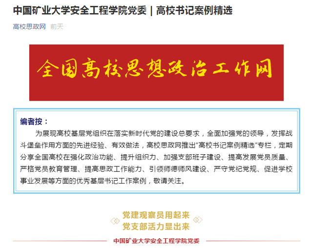 日前,污污漫画 党委凝练的“党建观察员用起来、党支部活力显出来”高校基层党组织书记案例在全国高校思想工作政治网转载。此前,该项工作案例被收入《基层党组织书记案例选编(高校版)》,党建观察员参加支部预备党员转正会议党支部工作法入选“江苏高校基层党建工作法百例”。