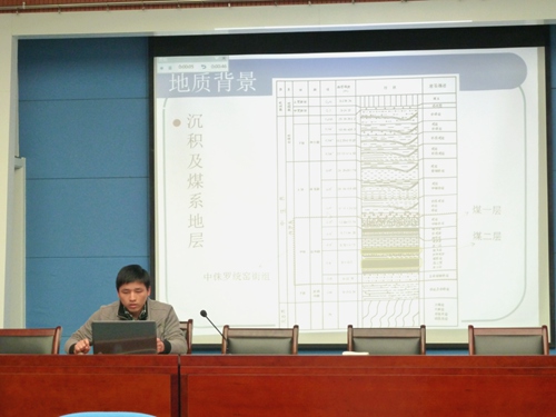 孟国栋首先作报告,报告题目是《FLUENT数值模拟在采空区治理中的应用》,他针对煤矿采空区的实际情况进行fluent模拟,然后经过数值模拟和解算,为采空区危害治理提供依据。其次,陈明义向大家详细介绍了油页岩的发展,同时讲述了对窑街煤田油页岩孔隙结构及吸附放散