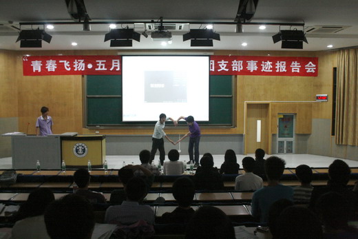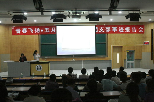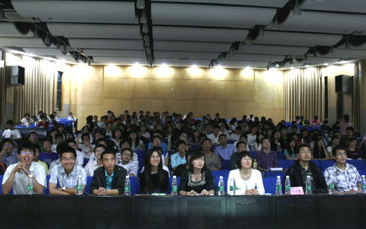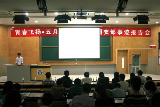 知行社社长贾伟同学的主持下正式开始,本次活动分为风采展示、观众提问以及嘉宾总结三个环节。十五个先进团支部代表按照抽签次序依次上台展示,他们以PPT、电子杂志、视频图像等资料为载体,向现场的老师及同学展示出各自团支部建设的方法及丰 硕成果。他们分别介绍了团支部在思想建设、学风建设、特色工作等各方面取得的成果及经验,精彩的展示赢得了现场观众的阵阵掌声。现场气氛异常热烈,走上镜湖大讲堂的各个团支部也备受鼓舞。其中,机自08-10班团支部提出的“班级荣誉至上”的理念、德语07-1班团支部介绍的“我们如此优秀——说出同学的优点”活动、信安07-1班团支部介绍的“三年后的我”主题班会、地质08-3班团支部介绍的评选“班级学习标兵、卫生标兵”活动等给现场的老师和观众留下了深刻印象,同时也为团支部建设提供了宝贵的经验。