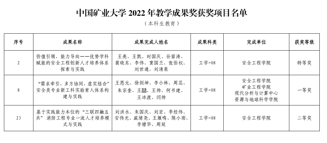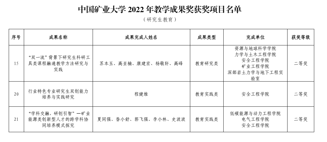 以第一完成单位申报的《“需求牵引,多方协同,虚实结合” 安全类专业新工科实验育人体系构建与实践》获一等奖;以刘洪永副教授为第一完成人申报的《基于实践能力本位的“三联四融五共” 消防工程专业一流人才培养模式与实践》 、程健维副教授申报的《行业特色专业研究生双创能力培养与实践研究》、康建宏副教授参与的《“双一流”背景下研究生科研工具类课程融通教学方法研究与实践》以及史波波副教授参与的《“学科交融,研创引智”—矿业能源类创新型人才的跨学科协同培养模式探究》获得二等奖。