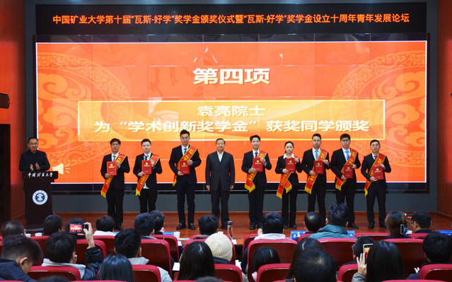颁奖仪式上,袁亮院士和李江涛分别为第十届“瓦斯-好学”奖学金学术创新类和“瓦斯-好学”奖学金学业优秀类获奖同学颁奖。