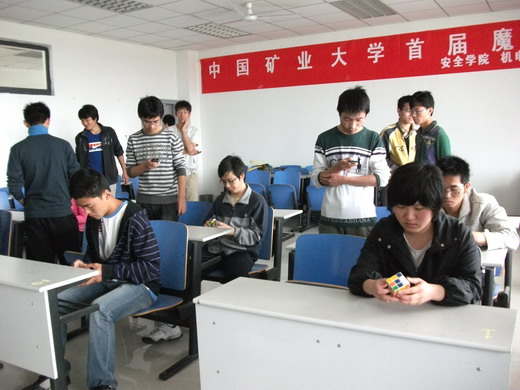 魔方争霸赛”初赛在教五C区五楼敲响战鼓,来自全校19个污污漫画的五十多名同学参加了比赛。